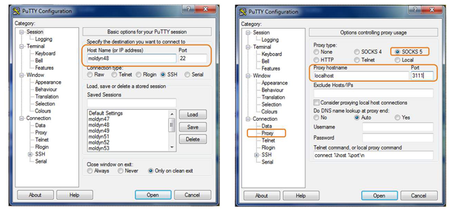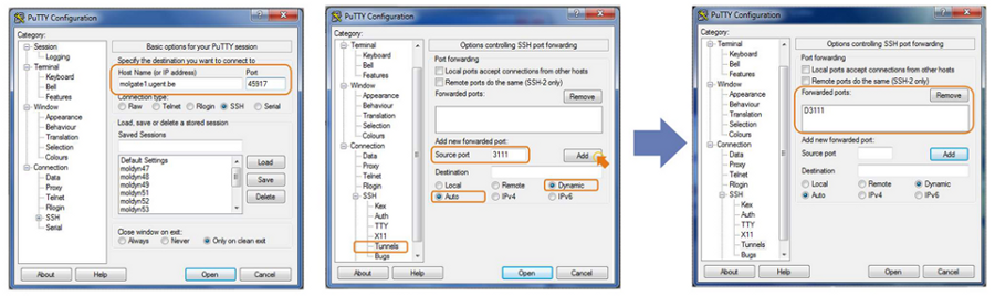 Probably the easiest programs to use to connect to the moldyn servers are PuTTY (http://www.chiark.greenend.org.uk/~sgtatham/putty/download.html) in order to execute commands WinSCP (http://winscp.net/eng/docs/lang:nl) to copy files It is convenient to set up one of the molgates as a SOCKS5 Proxy, as this will allow you to connect directly to all moldyn servers. This is not necessary if you're in the CMM building in Zwijnaarde: there you can connect directly with the moldyn servers. To do this, configure PuTTY to connect to molgate1 or molgate2 as indicated in the figure below: