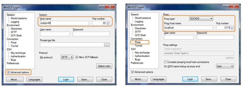 You can also transfer files directly from the servers to your own computer, by setting up WinSCP to use the SOCKS5 Proxy (make sure the box for 'Advanced options' is checked):