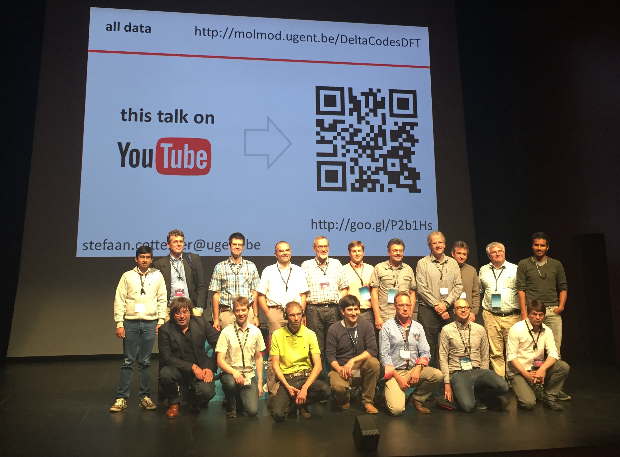 At the Psi-k 2015 meeting, the main results of the Δ-project were presented, and 18 of the many collaborators met on stage. See the video (left) for a 15-minute summary about the interpretation of the data set on this page. The group picture (right) shows from left to right: (front row) Nicola Marzari, Phil Hasnip, Stefaan Cottenier, Andris Gulans, Michiel van Setten, Sven Lubeck, Kay Dewhurst; (back row) Santanu Saha, François Gygi, Kurt Lejaeghere, Gian-Marco Rignanese, Peter Blaha, Kevin Garrity, Marc Torrent, Matt Probert, Gustav Bihlmayer, Keith Refson, José Flores-Livas.