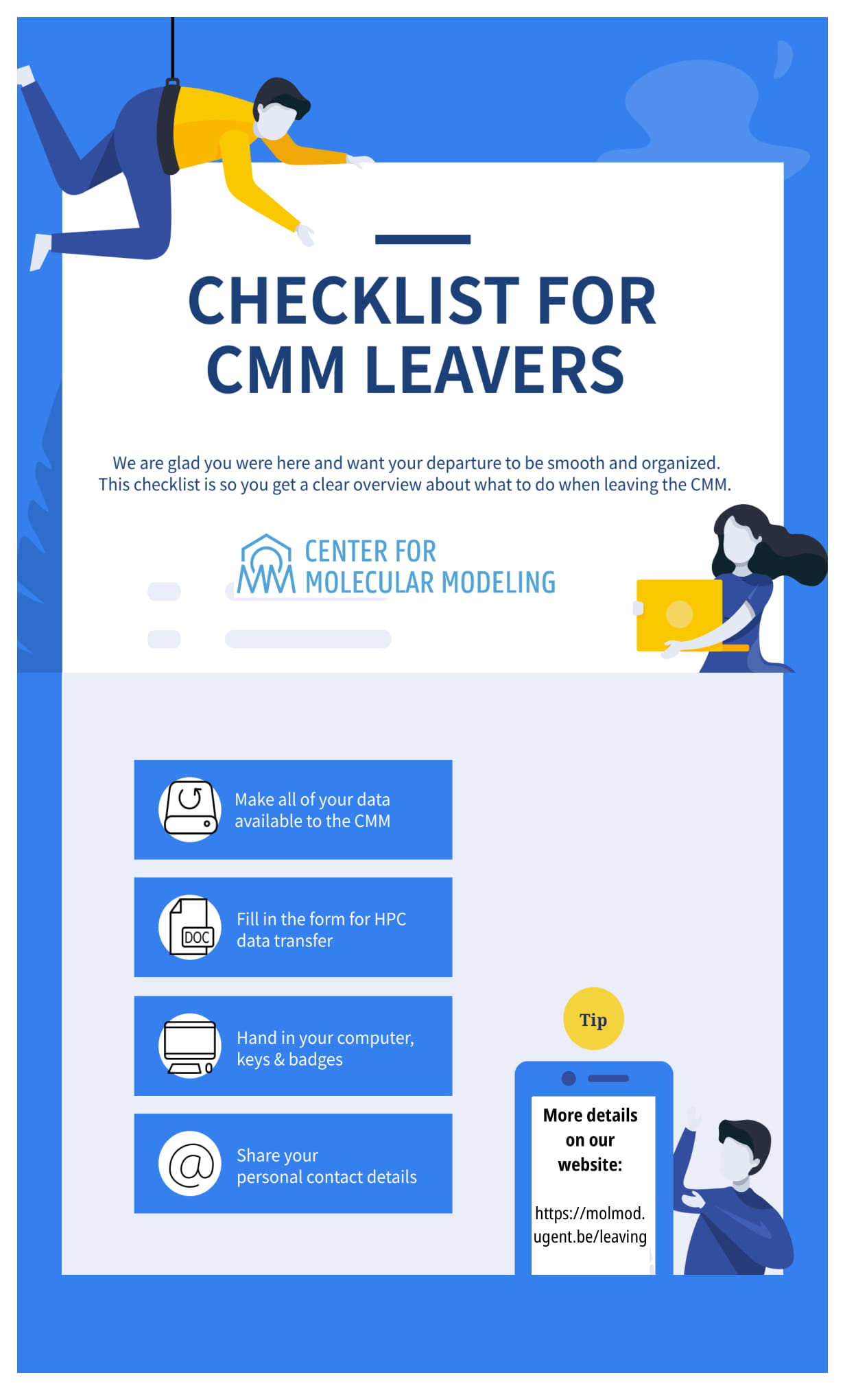 - Make all of your data available to the CMM. You should hand in an external drive (available at the administrative office) with your data related to articles (original tex, word files, figures,…), presentations,… Apart from that, you should store your data regarding calculations on our moldyn58 & most essential data on your hard drive. Also provide us with a table of contents (readme) regarding your data. Go through the list together with your direct supervisor or another person assigned by your supervisor. More practical information about archiving data can be found here (it is mainly focused on HPC but general good practices are mentionned as well).