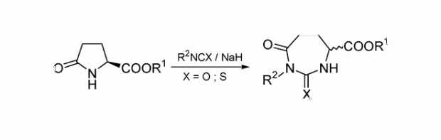 A straightforward ring transformation giving polymethylenebis(hydantoins) was extended, as these are HMBA analogues. Firstly, ethyl or allyl pyroglutamate was carbamoylated with a diisocyanate. Upon treatment with KOtBu in allyl alcohol the bis(carbamoyllactam) rearranged to give the hydantoin, which was followed by the ring-opening of the pyrrolidinone with formation of the allyl ester. These compounds were subsequently ring-closed in the presence of second-generation Grubbs' catalyst to form macrocycles containing the ester functionality in the ring. It was established by HSQC experiments with inverse detection that only the E isomers were formed in the cases of the 24- and 26-membered heterocycles. (© Wiley-VCH Verlag GmbH & Co. KGaA, 69451 Weinheim, Germany, 2008)