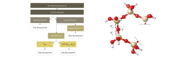 An efficient protocol is presented to identify signals in vibrational spectra of silica oligomers based on theoretical molecular dynamics (MD) simulations. The method is based on the projection of the atomic velocity vectors on the tangential directions of the trajectories belonging to a predefined set of internal coordinates. In this way only contributions of atomic motions along these internal coordinates are taken into consideration. The new methodology is applied to the spectra of oligomers and rings, which play an important role in zeolite synthesis. A suitable selection of the relevant internal coordinates makes the protocol very efficient but relies on intuition and theoretical insight. The simulation data necessary to compute vibrational spectra of relevant silica species are obtained through MD using proper force fields. The new methodology—the so-called velocity projection method—makes a detailed analysis of vibrational spectra possible by establishing a one-to-one correspondence between a spectral signal and a proper internal coordinate. It offers valuable perspectives in understanding the elementary steps in silica organization during zeolite nanogrowth. The so-called velocity projection method is generally applicable on data obtained from all types of MD and is a highly valuable alternative to normal-mode analysis which has its limitations due to the presence of many local minima on the potential energy surface. In this work the method is exclusively applied to inelastic neutron scattering, but extension to the infrared power spectrum is apparent.