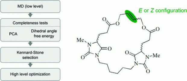 The properties and functions of (bio)molecules are closely related to their molecular conformations. A variety of methods are available to sample the conformational space at a relatively low level of theory. If a higher level of theory is required, the computational cost can be reduced by selecting a uniformly distributed set of conformations from the ensemble of conformations generated at a low level of theory and by optimizing this selected set at a higher level. The generation of conformers is performed using molecular dynamics runs which are analyzed using the MD-Tracks code [ J. Chem. Inf. Model. 2008, 48, 2414]. This article presents a Kennard−Stone-based algorithm, with a distance measure based on the distance matrix, for the selection of the most diverse set of conformations. The method has been successfully applied to macrocyclic alkenes. The correct thermodynamic stability of the double-bond isomers of a flexible macrocyclic alkene containing two chiral centers is reproduced. The double-bond configuration has a limited effect on the conformation of the whole macrocycle. The chirality of the stereocenters has a larger effect on the molecular conformations.