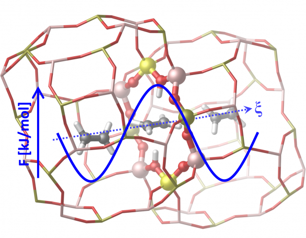 The methanol-to-olefins process over H-SAPO-34 is characterized by its high shape selectivity toward light olefins. The catalyst is a supramolecular system consisting of nanometer-sized inorganic cages, decorated by Brønsted acid sites, in which organic compounds, mostly methylated benzene species, are trapped. These hydrocarbon pool species are essential to catalyze the methanol conversion but may also clog the pores. As such, diffusion of ethene and propene plays an essential role in determining the ultimate product selectivity. Enhanced sampling molecular dynamics simulations based on either force fields or density functional theory are used to determine how molecular factors influence the diffusion of light olefins through the 8-ring windows of H-SAPO-34. Our simulations show that diffusion through the 8-ring in general is a hindered process, corresponding to a hopping event of the diffusing molecule between neighboring cages. The loading of different methanol, alkene, and aromatic species in the cages may substantially slow down or facilitate the diffusion process. The presence of Brønsted acid sites in the 8-ring enhances the diffusion process due to the formation of a favorable π-complex host–guest interaction. Aromatic hydrocarbon pool species severely hinder the diffusion and their spatial distribution in the zeolite crystal may have a significant effect on the product selectivity. Herein, we unveil how molecular factors influence the diffusion of light olefins in a complex environment with confined hydrocarbon pool species, high olefin loadings, and the presence of acid sites by means of enhanced molecular dynamics simulations under operating conditions.