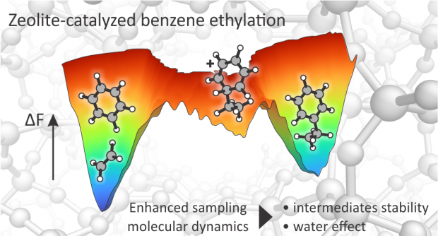 Zeolite-catalyzed benzene ethylation is an important industrial reaction, as it is the first step in the production of styrene for polymer manufacturing. Furthermore, it is a prototypical example of aromatic electrophilic substitution, a key reaction in the synthesis of many bulk and fine chemicals. Despite extensive research, the reaction mechanism and the nature of elusive intermediates at realistic operating conditions is not properly understood. More in detail, the existence of the elusive arenium ion (better known as Wheland complex) formed upon electrophilic attack on the aromatic ring is still a matter of debate. Temperature effects and the presence of protic guest molecules such as water are expected to impact the reaction mechanism and lifetime of the reaction intermediates. Herein, we used enhanced sampling ab initio molecular dynamics simulations to investigate the complete mechanism of benzene ethylation with ethene and ethanol in the H-ZSM-5 zeolite. We show that both the stepwise and concerted mechanisms are active at reaction conditions and that the Wheland intermediate spontaneously appears as a shallow minimum in the free energy surface after the electrophilic attack on the benzene ring. Addition of water enhances the protonation kinetics by about 1 order of magnitude at coverages of one water molecule per Brønsted acidic site. In the fully solvated regime, an overstabilization of the BAS as hydronium ion occurs and the rate enhancement disappears. The obtained results give critical atomistic insights in the role of water to selectively tune the kinetics of protonation reactions in zeolites.