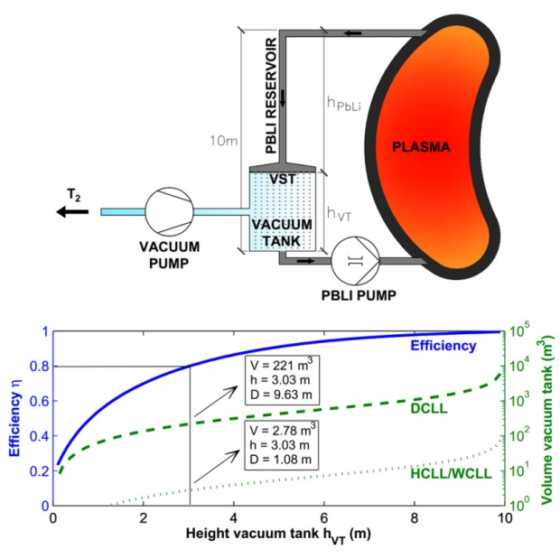 Tritium self-sufficiency within a nuclear fusion reactor is necessary to demonstrate nuclear fusion as a viable source of energy. Tritium can be produced within liquid eutectic PbLi but then has to be extracted to be refuelled to the plasma. The vacuum sieve tray (VST) method is based on the extraction of tritium from millimetre-scaled oscillating PbLi droplets falling inside a vacuum chamber. A simulation tool was developed describing the fluid dynamics occurring along the PbLi flow and was used to study the influence of the different geometrical and operational parameters on the VST performance. The simulation predicts that extraction efficiencies over 90% can be easily reached according to theory and previous experimental results. The size of the VST extraction unit for a fusion reactor is estimated based on the findings from our single-nozzle model and assuming no T reabsorption. It is found to be in the feasible range. Nevertheless, two approaches are discussed which may further reduce this size by up to 90%. The simulation tool proved to be an easy and powerful way to analyse and optimise VST set-ups at any scale.