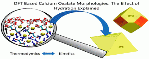 Monohydrated and dihydrated calcium oxalates have been widely studied in the literature because of their role in urolithiasis, a mammal pathology responsible for the formation of stones in the kidney. It is clear that the physicochemical environment plays a crucial role in the crystal growth and the resulting morphologies of calcium oxalates. To study these processes, reliable models for the calcium oxalates’ faces, exposed to water and potential additives, are needed. Here, we have used a total surface energy minimization approach to predict the crystal morphology of the calcium oxalate monohydrate and dihydrate phases. Surface energies were calculated at density functional theory level, taking into account surface relaxation and the effect of solvation. An excellent agreement was found between theoretically predicted morphologies and their experimental counterparts obtained by SEM, clearly demonstrating the importance of the inclusion of water in the model for the prediction of morphologies.