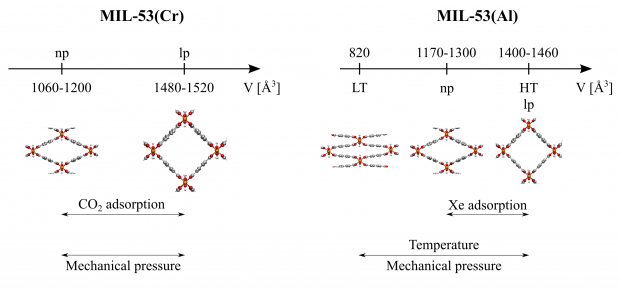 A new semi-analytical model is proposed to rationalize breathing of MIL-53 type materials. The model is applied on two case studies, the guest-induced breathing of MIL-53(Cr) with CO 2 and CH 4 , and the phase transformations for MIL-53(Al) upon xenon adsorption. Experimentally, MIL-53(Cr) breathes upon CO 2 adsorption, which was not observed for CH 4 . This result could be ascribed to the stronger interaction of carbon dioxide with the host matrix. For MIL-53(Al) a phase transition from the large pore phase could be enforced to an intermediate phase with volumes of about 1160 − 1300 A, which corresponds well to the phase observed experimentally upon xenon adsorption. Our thermodynamic model correlates nicely with the adsorption pressure model proposed by Coudert et al. Furthermore the model can predict breathing behavior of other flexible materials, if the user can determine the free energy of the empty host, the interaction energy between a guest molecule and the host matrix and the pore volume accessible to the guest molecules. This will allow to generate the osmotic potential from which the equilibria can be deduced and the anticipated experimentally observed phase may be predicted.