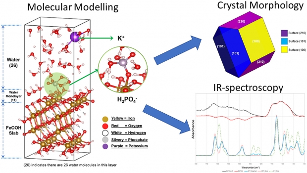 The thorough understanding of the adsorption mechanism of phosphate on hydrous ferric oxides is necessary to deal with the environmental issues related to high phosphate concentrations in soils and open water. In this work, we consider three different adsorption geometries (monodentate and bidentate chemisorption and physisorption) and calculate the adsorption geometries and related adsorption energies at optPBE-vdW level. Using the Maxwell-Boltzmann distribution, it is estimated that about 83% of the phosphate molecules is in a monodentate chemisorption configuration, while 17% is physisorbed. Furthermore, theoretical infra-red spectra are obtained and compared to equivalent experimental spectra, supporting the conclusion that mainly monodentate chemisorption and physisorption occur. Most interestingly, a weighed infra-red spectrum is then calculated, using the weights from the Maxwell-Boltzmann distribution, showing a very good comparison with the experimental spectra.