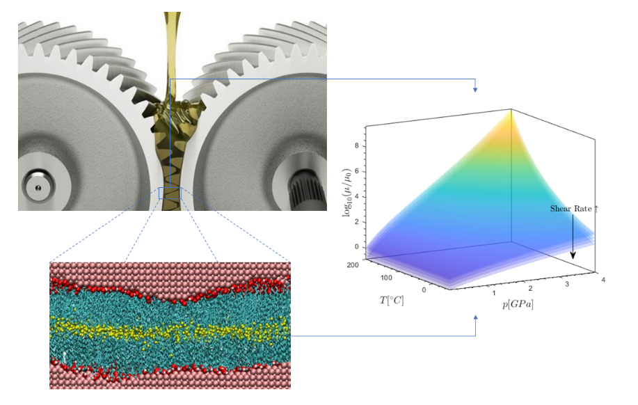 The main objective is to map the macroscopic thermo-physical properties of a lubricant in a wide pressure, temperature and shear rate range relevant for elasto-hydrodynamic lubrication. These properties include,
